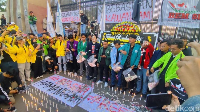 Aliansi BEM SI menggelar aksi damai di depan gedung DPR RI. Massa BEM SI membagikan mawar hingga menaburkan bunga di depan pagar gedung DPR RI.