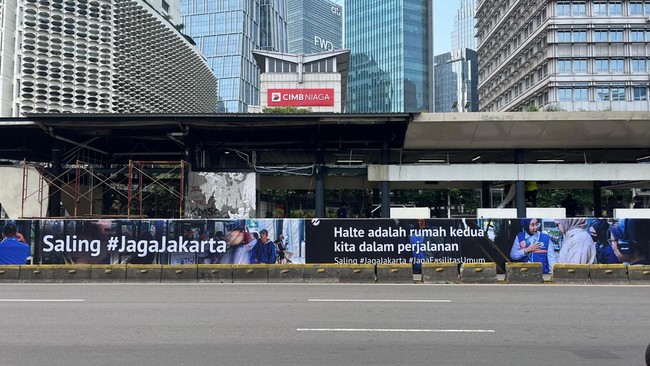 Di depan halte, terpasang pembatas proyek dengan spanduk bertuliskan pesan pemulihan. "Halte adalah rumah kedua kita dalam perjalanan. Saling #JagaJakarta #JagaFasilitasUmum," demikian isi spanduk.