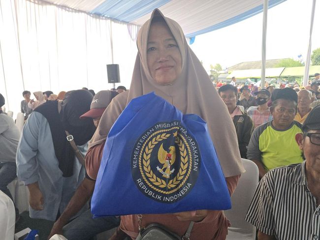 Kementerian Imigrasi dan Permasyarakatan (Imipas) menggelar bakti sosial (baksos) di Cilacap, Jawa Tengah (Jateng) dengan melibatkan warga pesisir. Salah satu warga yang hadir, Suparni (60), mengaku senang karena dapat membawa pulang bantuan sosial (bansos) berupa paket sembako.