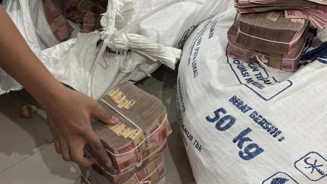 Di dalam karung itu terdapat uang pecahan Rp 100 ribu. Tampak uang pecahan Rp 100 ribu itu diikat dengan benang sekitar Rp 100 juta. Dalam karung terdapat beberapa ikat uang tersebut.