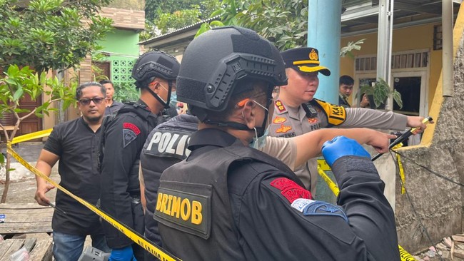 Tim Detasemen Gegana Satuan Brimob Polda Metro Jaya melakukan olah tempat kejadian perkara (TKP) ledakan di Jalan Talas 2, Pondok Cabe Ilir, Pamulang, Tangsel. Hasil olah TKP dugaan ledakan terjadi disebabkan oleh gas yang terakumulasi di ruangan tertutup.