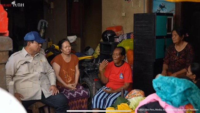 Prabowo lalu menghampiri gang kecil di daerah tersebut. Ia terlihat meninjau lokasi rumah warga setempat dan menanyakan kondisi.