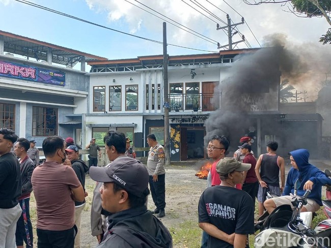 Kaca kafe itu pun tampak pecah dan berlubang usai dirusak massa. Setelah massa bubar, tampak jelaga hitam menempel di tiang yang berada di depan kafe. Area kafe itu pun dipasangi garis polisi.