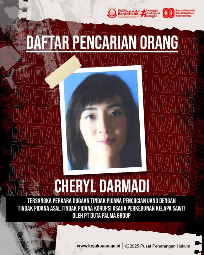 Sebagai informasi, Cheryl telah ditetapkan sebagai buron dalam perkara dugaan tindak pidana pencucian uang (TPPU) dari tindak pidana korupsi usaha perkebunan kelapa sawit oleh PT Duta Palma Group.