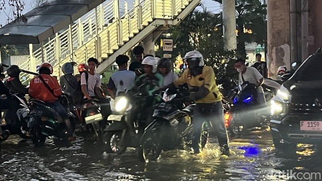 Pantauan detikcom di perempatan Ulujami, Jaksel, Selasa (16/9/2025) sekira pukul 18.30 WIB, lalu lintas masih tersendat. Beberapa pengendara terlihat menuntun kendaraannya menuju ruas jalan yang tak tergenang air.