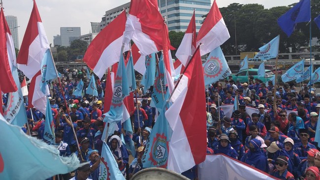 Aliansi buruh menggelar aksi unjuk rasa di depan gedung DPR/MPR RI hari ini. Massa buruh membawa lima tuntutan dalam demo hari ini.