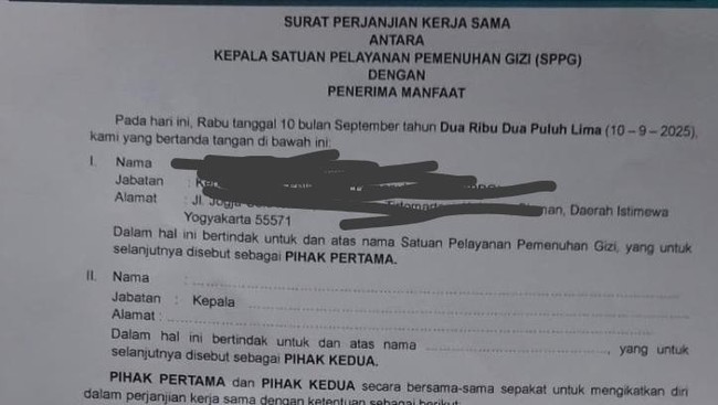 Foto surat perjanjian meminta sekolah merahasiakan kejadian apabila terjadi keracunan Makan Bergizi Gratis (MBG) beredar. Pemkab Sleman meminta klarifikasi terhadap Badan Gizi Nasional (BGN) perwakilan Sleman.