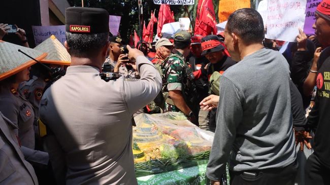 Kapolres Metro Jakarta Selatan Kombes Nicolas Ary Lilipaly turun menemui massa aksi dari kelompok petani di depan gedung Kementerian Pertanian (Kementan). Nicolas menyambut massa dan memberikan tumpeng kepada peserta aksi.