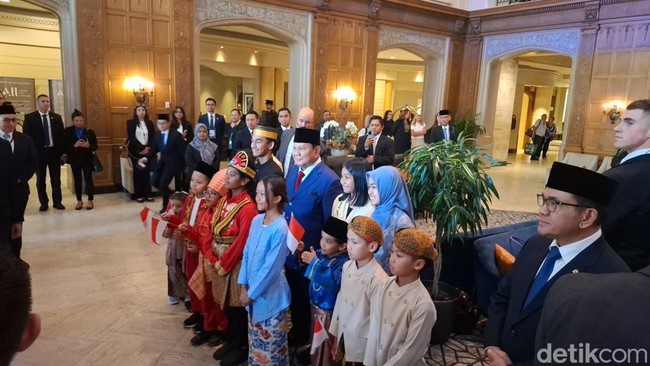 Turun dari mobil, Prabowo disambut diaspora Indonesia terdiri dari anak-anak, orang tua, hingga pemuda-pemudi. Diaspora mengenakan pakaian adat, jas hingga pakaian khas asal Indonesia.