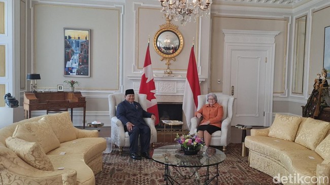 Prabowo diterima Mary Simon di Rideau Hall, Ottawa, pada Rabu (24/9/2025), pukul 16.11 waktu setempat. Prabowo diterima dalam ruangan yang berisi sejumlah lukisan dan tampak sepasang wayang dengan kain Bali.