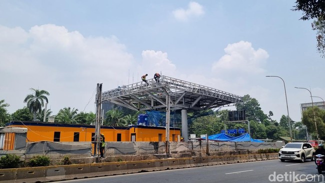 Penutupan jalan juga terlihat di GT Semanggi 1. Perbaikan atap dan gardu gerbang tol masih berlangsung.