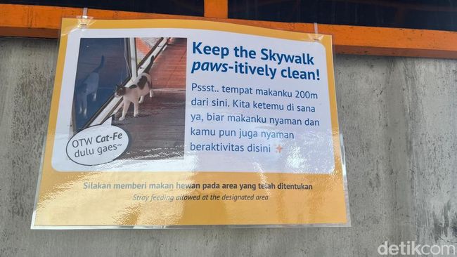 "Keep The Skywalk paws-itively clean!" begitu bunyi peringatan itu. Warga yang melintas diminta untuk tidak memberi makan kucing di sekitar skywalk.