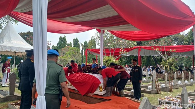 Upacara pemakaman dipimpin Wakil Presiden Gibran Rakabuming, Senin (6/10/2025). Dia didampingi Menteri Koordinator Politik dan Keamanan (Menko Polkam) Djamari Chaniago.