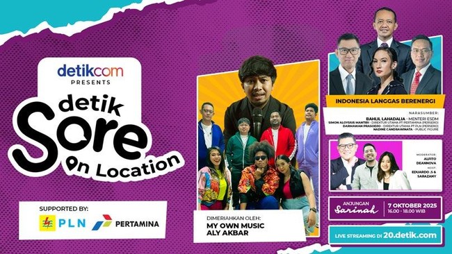 Sederet upaya ini akan dikupas tuntas oleh Menteri ESDM Bahlil Lahadalia, Dirut PLN Darmawan Prasodjo hingga Dirut Pertamina Simon Aloysius Mantiri melalui program detikSore on Location bertajuk 'Indonesia Langgas Berenergi. Diskusi ini akan berlangsung di Anjungan Sarinah, Jakarta Pusat pada Selasa, 7 Oktober 2025, pukul 16.00-18.00 WIB.