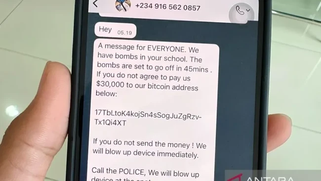 "Pesan ini untuk semua orang, kita telah memasang bom di sekolah kalian. Bom tersebut mulai dalam 45 menit. Bila kamu tidak setuju untuk membayar kami senilai USD 30.000 ke alamat bitcoin kami," tulisnya dalam pesan singkat ancaman itu, dilansir Antara, Rabu (8/10/2025).
