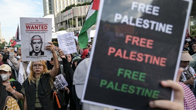 Warga menggelar aksi damai membela Palestina di Patung Kuda, Jakarta Pusat. Jalan Medan Merdeka Barat atau Selatan ditutup sementara.