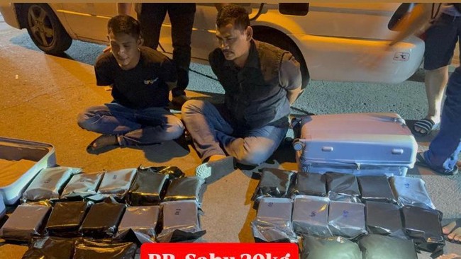 "Setelah dilakukan penggeledahan, ditemukan barang bukti berupa 2 (dua) buah koper berwarna biru berisi 20 Kg sabu dan 20.000 butir ekstasi," ujar Eko.