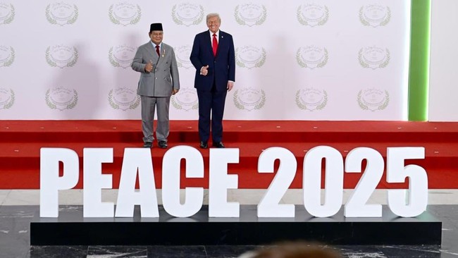 Ada momen menarik saat Presiden Amerika Serikat (AS) Donald Trump foto bersama Presiden Prabowo Subianto sebelum Konferensi Tingkat Tinggi (KTT) Perdamaian Gaza di Sharm El-Sheikh, Mesir. Trump dan Prabowo berfoto mengacungkan jempol layaknya gaya bapak-bapak.