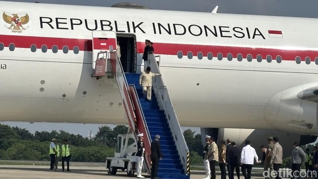Pantauan detikcom, Selasa (14/10/1015), pesawat Garuda Indonesia-1 yang ditumpangi Prabowo tiba di Lanud Halim Perdanakusuma pukul 14.39 WIB. Prabowo tiba bersama Menteri Luar Negeri Sugiono dan Seskab Teddy Indra Wijaya.