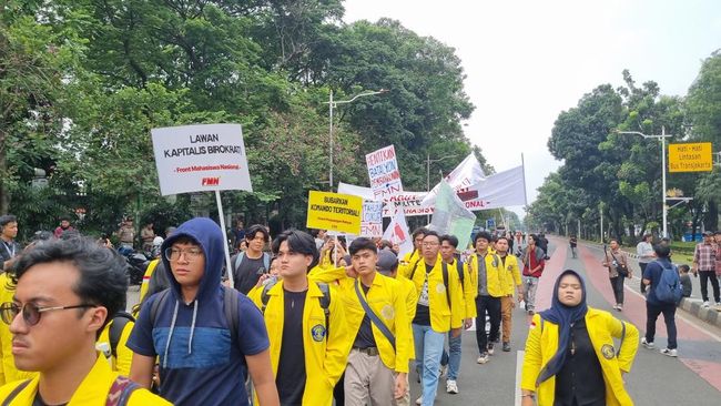 Massa dari Badan Eksekutif Mahasiswa Universitas Indonesia (BEM UI) melakukan demonstrasi di Jalan Medan Merdeka Selatan, Jakarta Pusat. Mereka membawa delapan tuntutan yang disebut 'Asta Cita Rakyat'.
