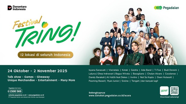 PT Pegadaian sambut meriah kehadiran aplikasi terbaru Tring! by Pegadaian dengan menggelar Festival Tring! di 12 kota yang tersebar di seluruh Indonesia. Festival akbar ini berlangsung dari 24 Oktober-02 November 2025 yang menjadi ajang perkenalan dan penanda resminya kehadiran aplikasi tersebut di tengah masyarakat Indonesia.