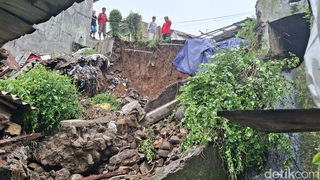 Tebing Penahan Tanah (TPT) setinggi 10 meter longsor imbas hujan deras di Bondongan, Kecamatan Bogor Selatan, Kota Bogor. Hujan menyebabkan 12 rumah terendam, begini penampakannya.