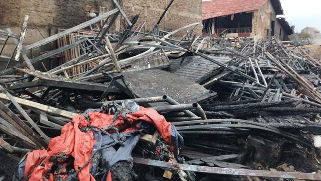Besi-besi untuk tenda dekorasi yang ada di dalam gudang juga tampak ikut hangus terbakar. Selain gudang, terlihat satu buah bangunan rumah yang ikut terbakar.
