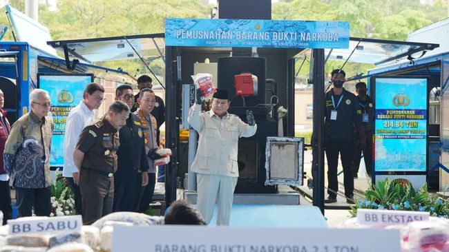 Presiden Prabowo Subianto menghadiri pemusnahan barang bukti (barbuk) narkotika 2,1 ton di Mabes Polri, Jakarta Selatan. Prabowo sempat secara langsung melakukan pemusnahan barang bukti narkotika tersebut bersama Kapolri Jenderal Listyo Sigit Prabowo.