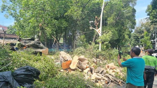 Pantauan detikcom di lokasi, Jumat (31/10/2025), sejumlah petugas sedang memotong pohon besar yang tumbang itu. Ada dua truk yang disiapkan mengangkut batang dan ranting-ranting yang telah dipotong.