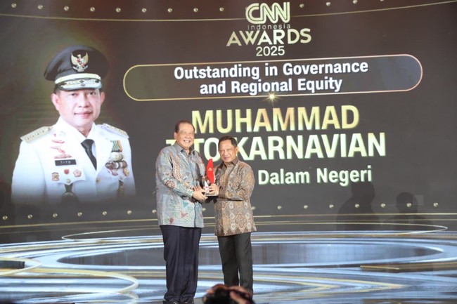 Menteri Dalam Negeri (Mendagri), Tito Karnavian meraih penghargaan Outstanding in Governance and Regional Equity dalam ajang bergengsi CNN Indonesia Awards 2025 yang digelar di Ritz Carlton Mega Kuningan, Jakarta, Jumat (31/10) kemarin. Penghargaan tersebut diserahkan langsung oleh Pendiri CT Corp, Chairul Tanjung (CT) sebagai bentuk apresiasi atas kepemimpinan Tito dalam memperkuat sinergi antara pemerintah pusat dan daerah.