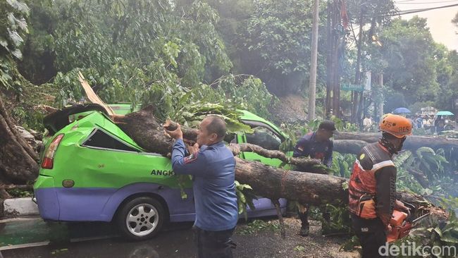 Pantauan detikcom, Senin (3/11/2025), tampak satu unit angkot tertimpa batang pohon berukuran besar. Kejadian ini mengakibatkan angkot ringsek.