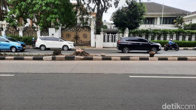 Penebangan kelima pohon tersebut menyisakan sedikit batang yang rata dengan trotoar. Sementara jarak antarpohon tidak beraturan.