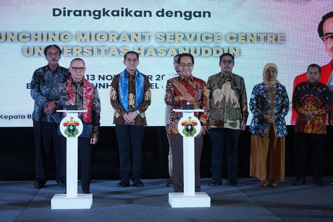 Menteri Pelindungan Pekerja Migran Indonesia (P2MI) Mukhtarudin meresmikan Migrant Service Centre (MSC) Universitas Hasanuddin (Unhas) di Makassar, Sulawesi Selatan (Sulsel), Kamis (13/11). Mukhtarudin menegaskan Unhas sebagai role model nasional bagi perguruan tinggi lain dalam mendukung pemberdayaan tenaga kerja migran Indonesia.