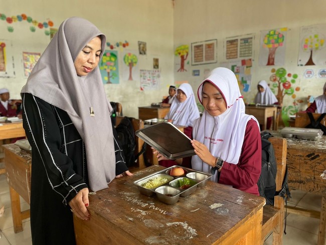 Di sekolah, makanan itu disambut oleh penerima manfaat. Senyum hingga tawa muncul saat penerima manfaat menikmati makanan.