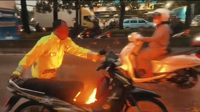 Motor milik warga sempat terbakar di kawasan Cengkareng, Jakarta Barat (Jakbar), saat banjir kemarin sore. Polantas yang tengah bertugas saat itu sigap membantu memadamkan api yang berkobar.