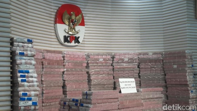 Uang rampasan itu dipamerkan di ruang konferensi pers Gedung Merah Putih KPK, Jakarta Selatan. Tumpukan uang tersebut terdiri dari pecahan Rp 100 ribu.