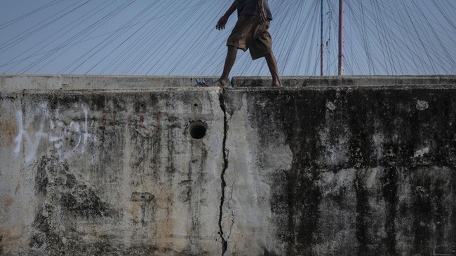Dilihat detikcom dalam video di media sosial Instagram pada Senin (24/11/2025), terlihat air laut merembes lewat area bawah tanggul yang sudah mulai sedikit retak. Air laut yang rembes dari tanggul pun membuat sedikit genangan di sisi lain tanggul yang merupakan area kolam renang.
