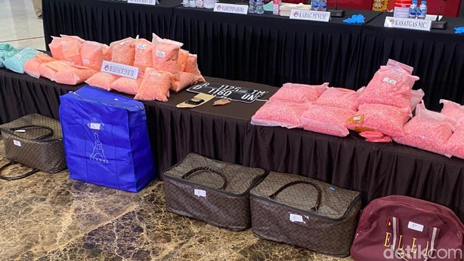 Pantauan detikcom, barang bukti ribuan ekstasi itu digelar dalam jumpa pers di gedung Bareskrim Polri, Jakarta Selatan, Selasa (25/11/2025). Tampak ditampilkan ekstasi berwarna merah muda, oranye, dan toska dalam puluhan bungkus.