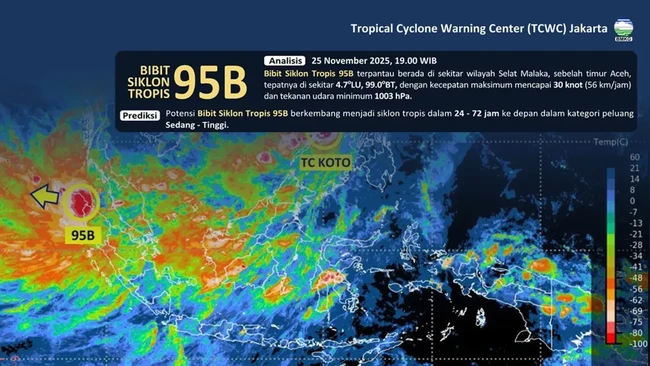 BMKG menyebut terdapat perkembangan signifikan Bibit Siklon Tropis 95B yang teridentifikasi sejak 21 November 2025 di perairan timur Aceh, Selat Malaka.