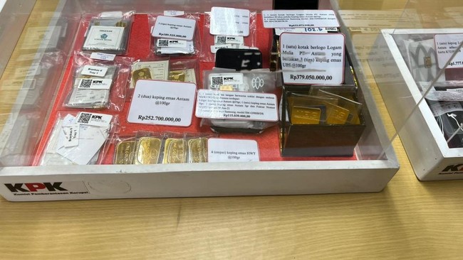 Dilihat detikcom di Gedung Rumah Penyimpanan Benda Sitaan Negara (Rupbasan) KPK, Jakarta Timur, Rabu (26/11/2025), terdapat beberapa paket logam mulia dan perhiasan yang disimpan di dalam beberapa kotak. Terlihat paket emas Antam 20 keping dengan berat 25 gram dan 1 unit HP Samsung memiliki harga limit Rp 633.073.000.