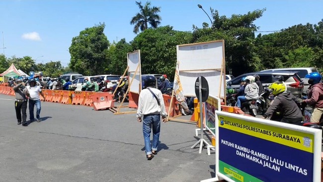 "Bukaken pak, yak opo rek (Buka saja pak, gimana, rek)," teriak seorang pengendara yang memakai kaos putih kepada petugas kepolisian di lokasi, Sabtu (7/8/2020).
