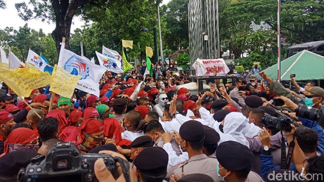 Massa menuntut Anies Baswedan untuk membatalkan UMP 2022. Aksi saling dorong terjaid saat massa memaksa masuk ke Balai Kota DKI.