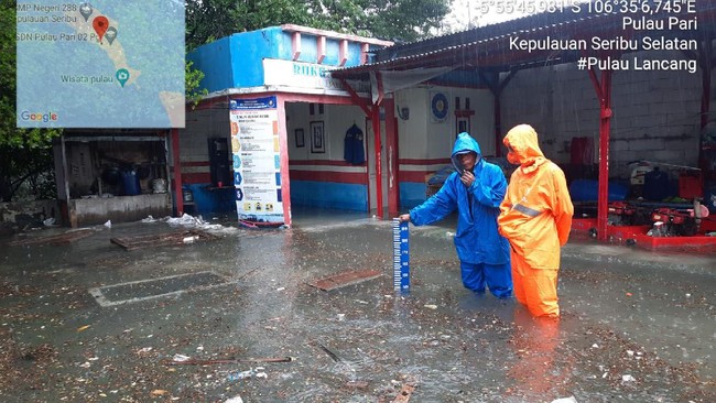 Jakarta - Banjir rob akibat air pasang terjadi di Kelurahan Pulau Pari, Kepulauan Seribu Selatan, Jakarta pada Sabtu (4/12). Air pasang terpantau menggenang di 6 titik.