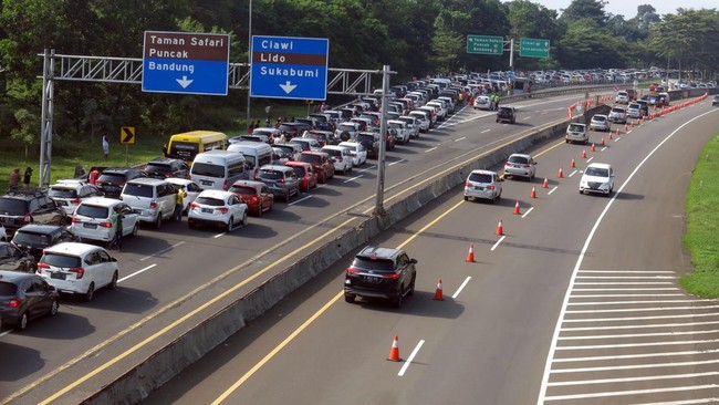 Jakarta - Jasa Marga berlakukan contraflow dari Gerbang Tol Ciawi hingga Km 46 ke arah Sukabumi. Contraflow untuk mengurai adanya kepadatan kendaraan yang mengarah ke Puncak.