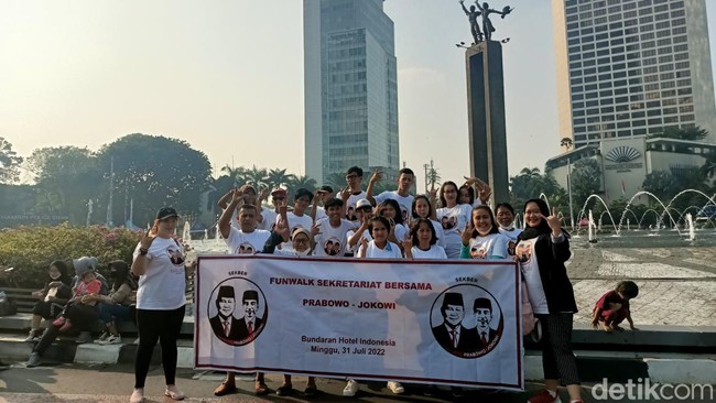 Jakarta - Sekretariat Bersama (Sekber) Prabowo-Jokowi dukung Prabowo Subianto dan Joko Widodo (Jokowi) untuk maju di Pilpres 2024 saat menggelar aksi fun walk di Bundaran HI, Jakarta Pusat. Mereka mengklaim aksi ini merupakan pemanasan sebelum acara yang lebih besar.