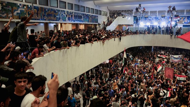 Jakarta - Ratusan pengikut ulama terkenal Irak, Muqtada al-Sadr kembali menduduki gedung parlemen pada Senin (1/8). Kekosongan pemerintahan yang sudah berlangsung 10 bulan membuat pendukung pro-Sadr menguasai gedung parlemen Irak.