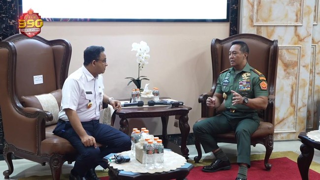Gubernur DKI Anies Baswedan berkunjung ke kantor Panglima TNI Jenderal Andika di Subden Merdeka Barat Denma Mabes TNI, Jakarta. Pertemuan keduanya diunggah di channel Youtube Andika Perkasa.