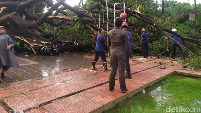Diketahui, pohon itu berdiameter 2,5 meter dengan tinggi 16 meter. Selain itu, pohon juga menimpa puluhan motor yang terparkir.
