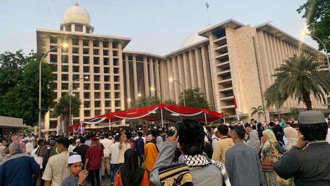 Ribuan jemaah yang hendak melaksanakan salat Idul Fitri 1444 H mulai mendatangi Masjid Istiqlal, Jakarta, pada Sabtu (22/4) pagi. Para jemaah yang hendak masuk terlihat datang bersama keluarga dan membawa peralatan salat.