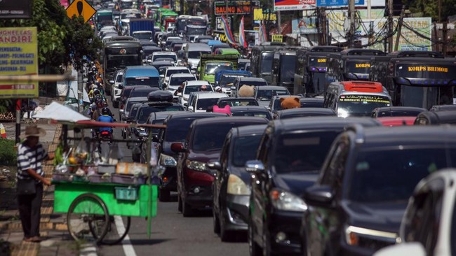 Bogor - Kemacetan terjadi di Simpang Gadog, Bogor, Jawa Barat, pada hari ketiga Idul Fitri 1445 Hijriah. Kemacetan terjadi mulai dari Gerbang Tol (GT) Ciawi Km 44 sampai Simpang Gadog.
